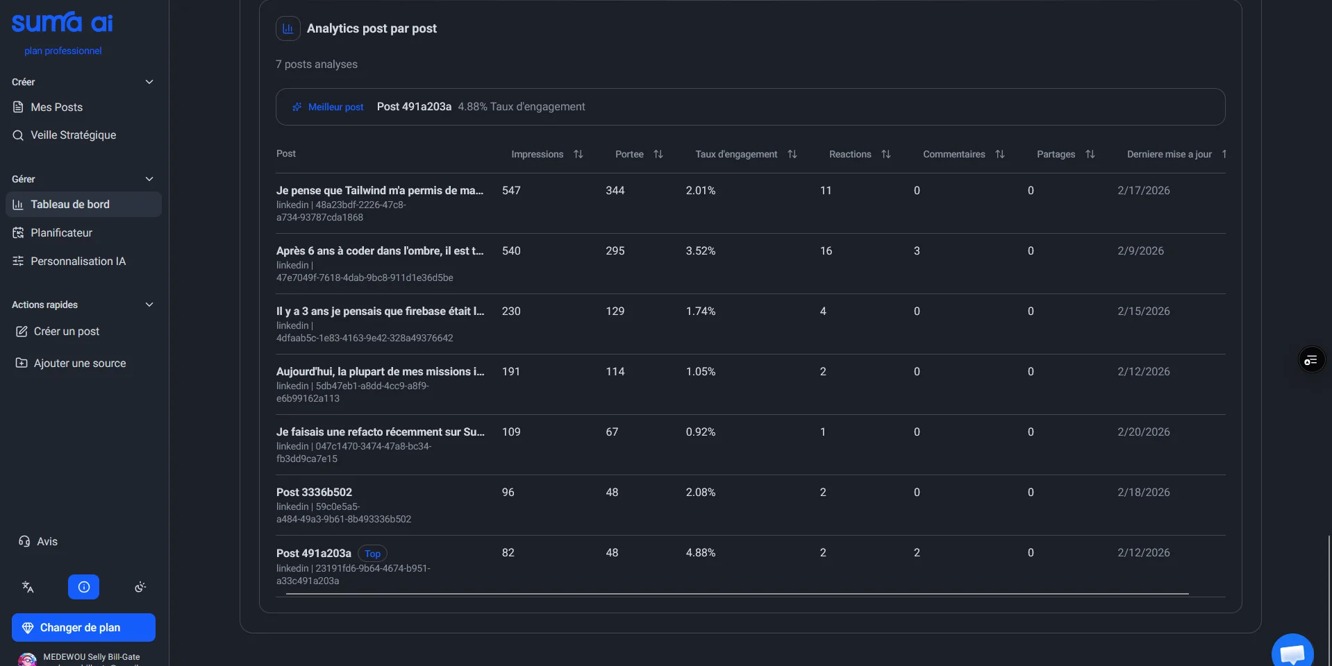 Accédez à une vue synthétique de toute votre analytique par post. Identifiez immédiatement le contenu qui génère le plus d'impressions et d'engagement pour optimiser votre stratégie.