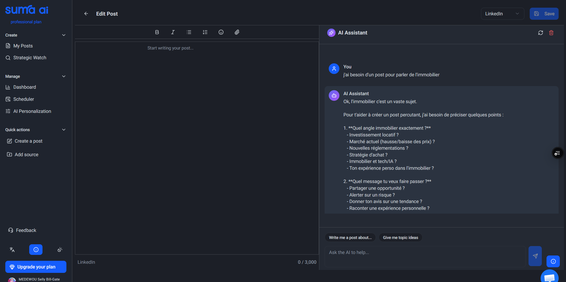 Décrivez simplement ce que vous voulez publier. Inspirez-vous des suggestions préconstruites ou formulez votre propre demande. L'assistant transforme instantanément votre idée en contenu structuré et engageant.
