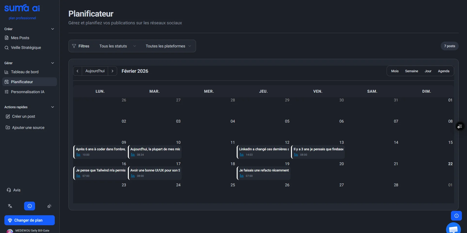 Centralisez toutes vos publications dans un tableau de bord clair et structuré. Filtrez, analysez et gardez le contrôle total sur votre calendrier éditorial.